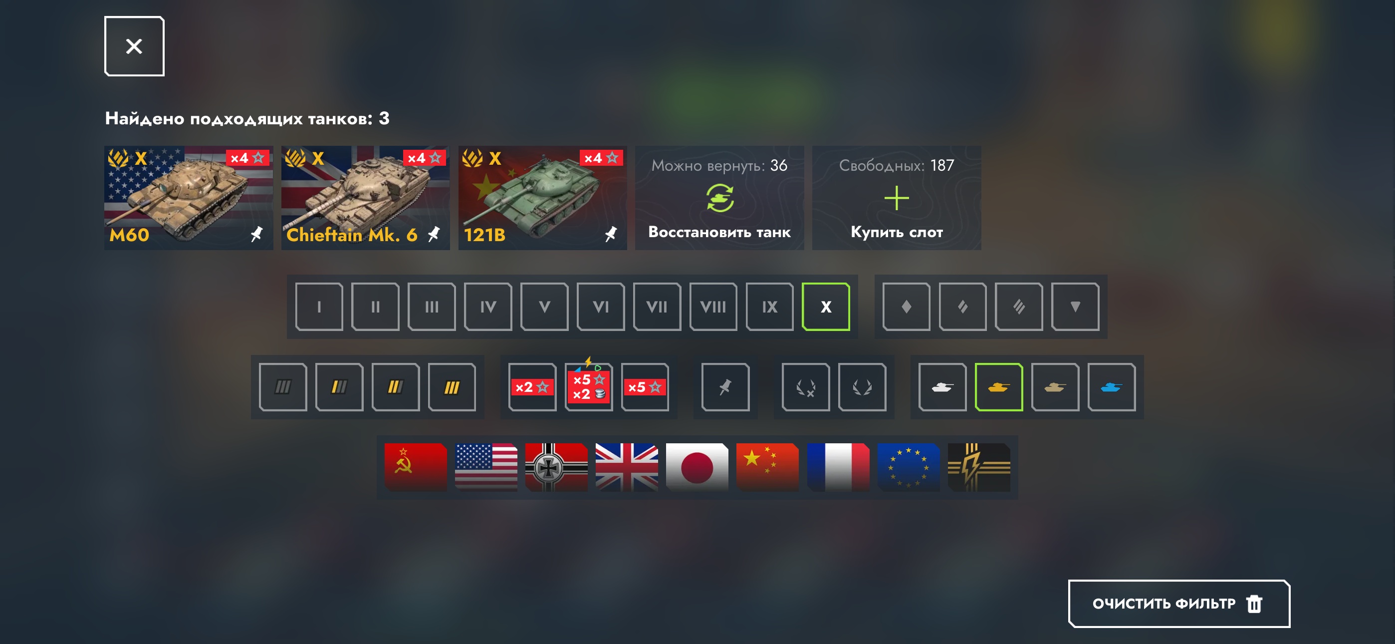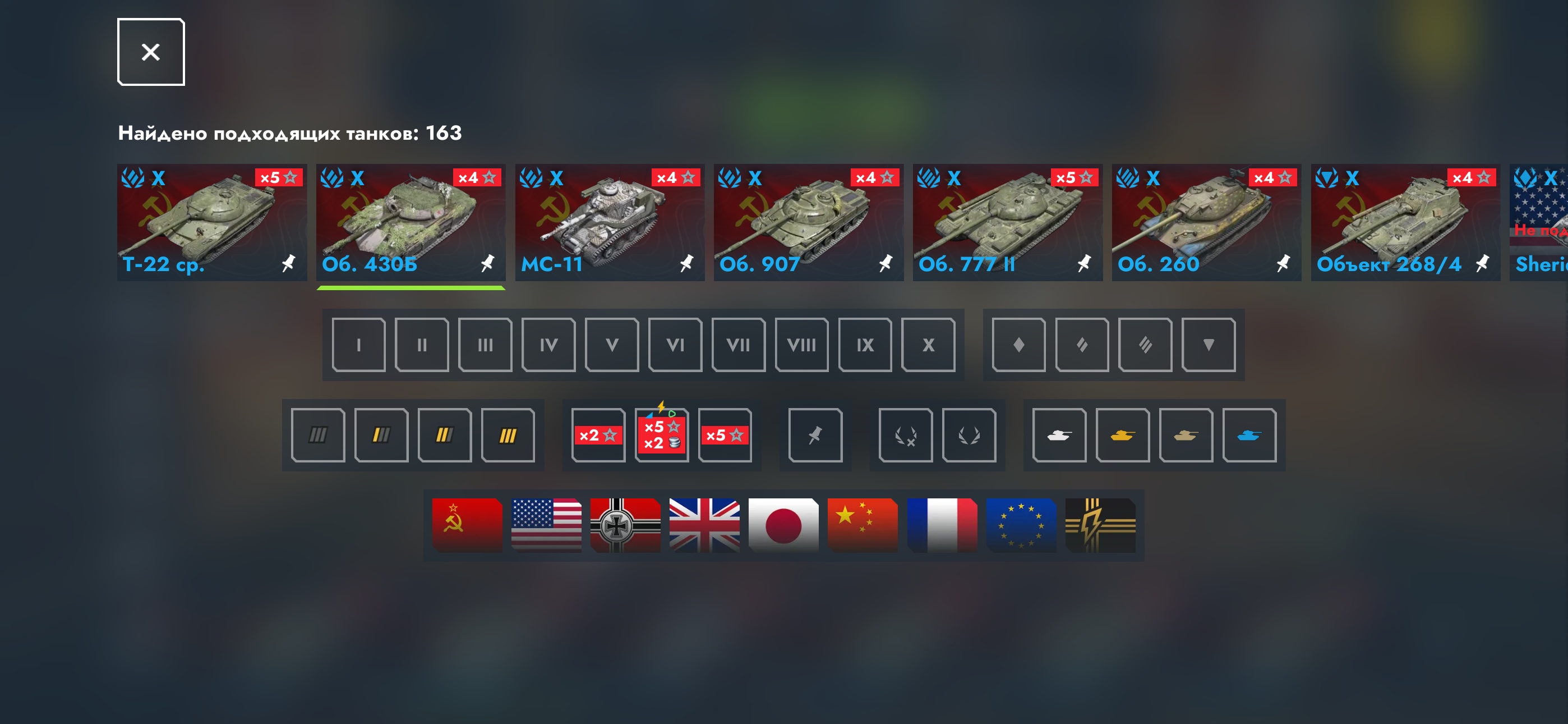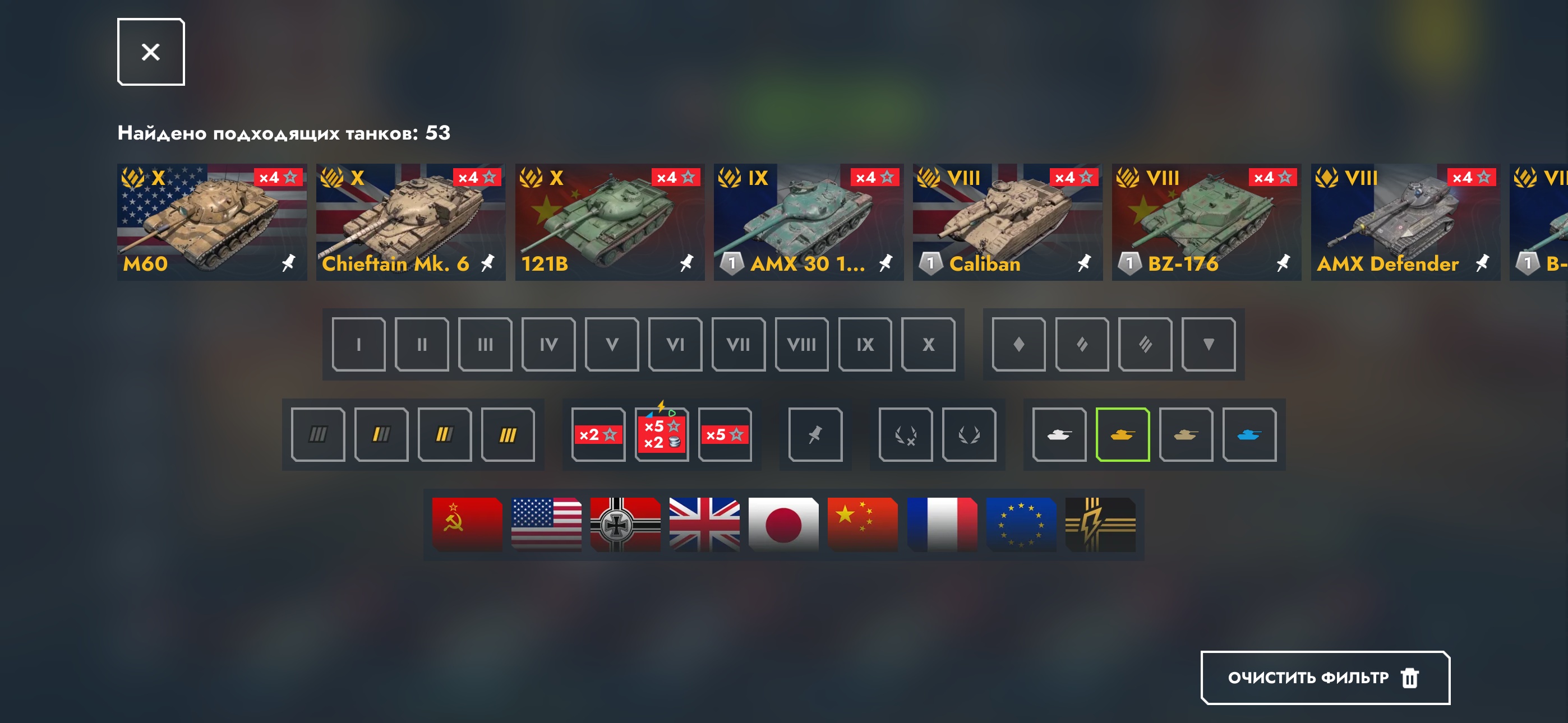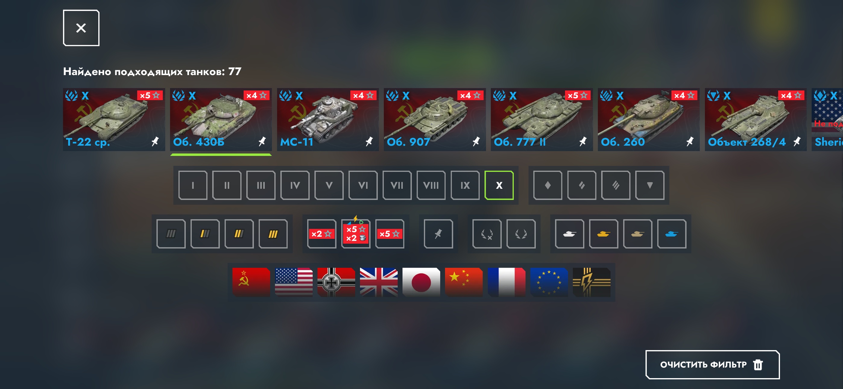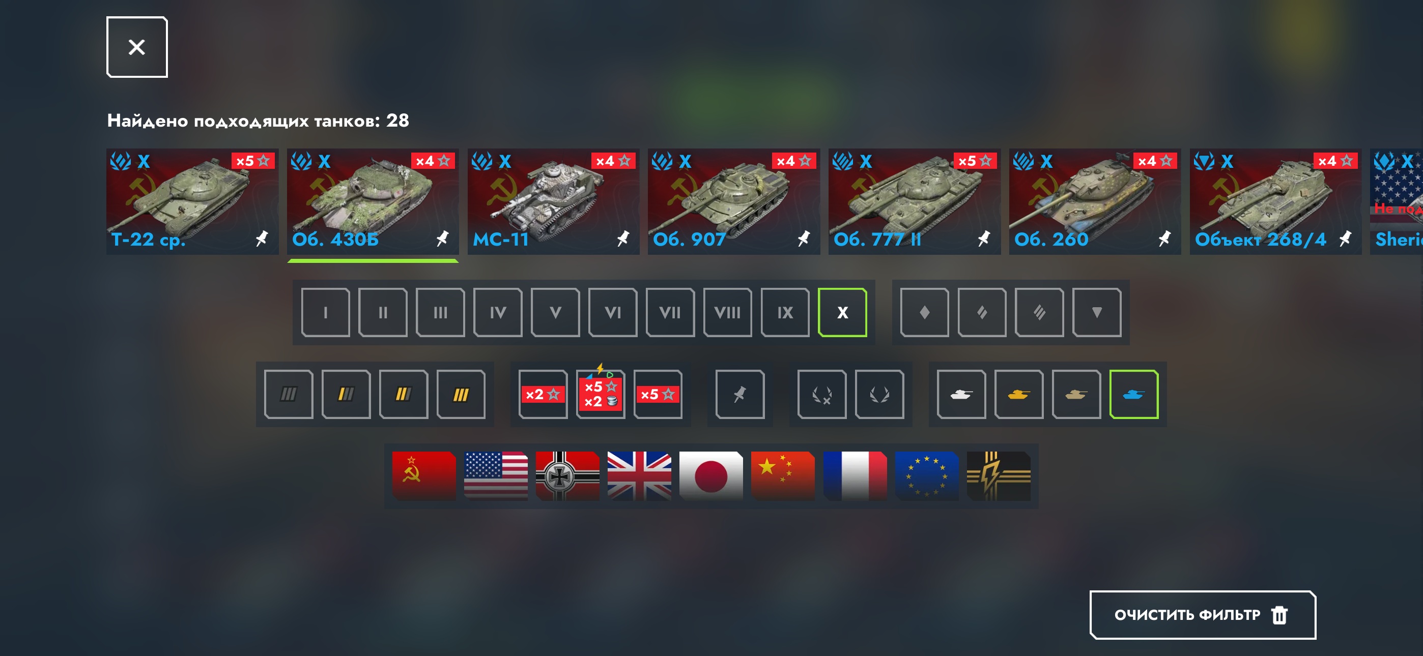 Коллекционки и премы X уровня: Т-22 ср., Об. 430б Смелый, Об. 907, МС-11 Полярник, Об. 777 II, Об. 260 Щука, Объект 268/4, М60, MBT-B, AAT60 Техноволна, XM66F, XM57, Vickers Mk. 3, Super Conqueror, Chieftain Mk. 6, Kpz 07 P(E) Виверна; Sheridan Ракетный; FV 215b 183 (бабаха); FV 217 Badger Аристократ, Type 63 Суперстар, 116-F3, WZ-111 5A Змей, AMX 30B, AMX M4 mle. 54, Carro 45t, Strv K,
